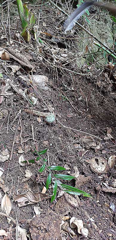 右側に立っている方が那覇教会長の林先生です。皆さんがクマデ等で土を掘り返してみると、戦後の慰霊祭などで使用されたゴミがかなり堆積している事が判明しました。一見ゴミが無いように見えますが、多くのゴミが風景に溶け込んでいると言う状況ですね。ご遺骨はこのゴミの下にあるはず。このゴミをどう対処するか‥‥。