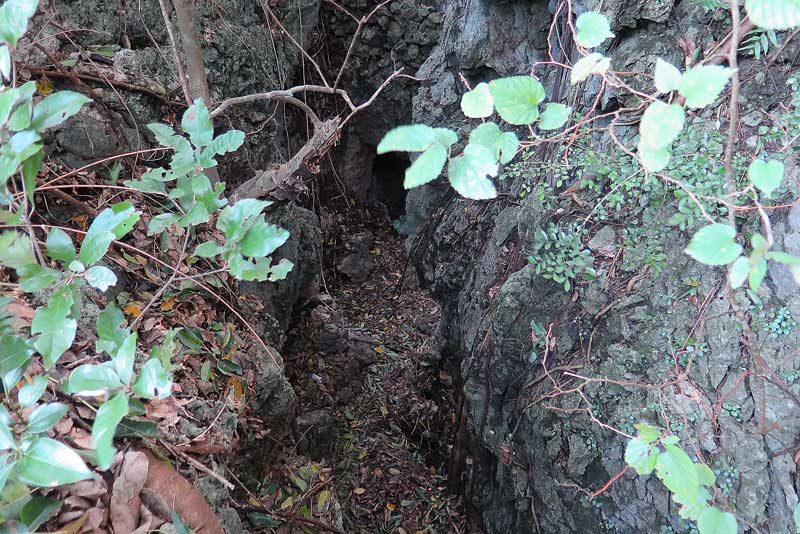 ここが二カ所目の壕口です。やはりこちらも立ち入り禁止となっています。ここは公園内の道路から近いですよ。50mも入らない内にこの風景が見えてきます。因みに、この壕口は上空を飛ぶ米軍の偵察機やグラマンなどからは絶対に見えない絶妙な位置に口が開いています。