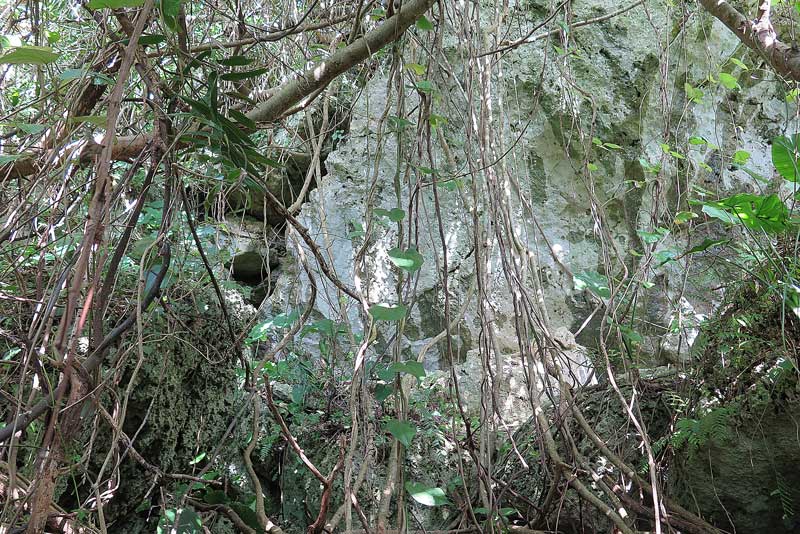 「白梅学徒看護隊之壕」の左手に、これまで私も気づきませんでしたが、ジャングルに入る道があるのですね。初めて入る場所ですから、ワクワクしながら50m程進んでみましたら、ご覧のように、急斜面となっていて陣地がある地形だと一目で解りました。