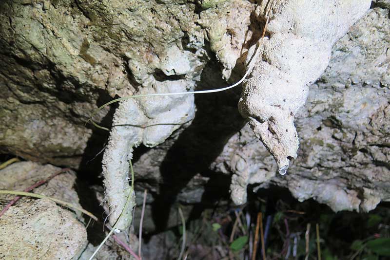 この鍾乳石の氷柱は、上の鍾乳石から水滴が落ちて形成されたのでしょうね。今は完全に乾いています。
