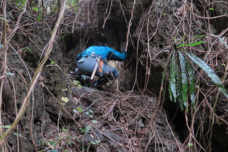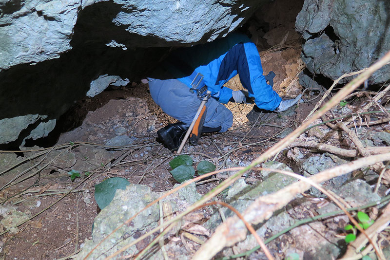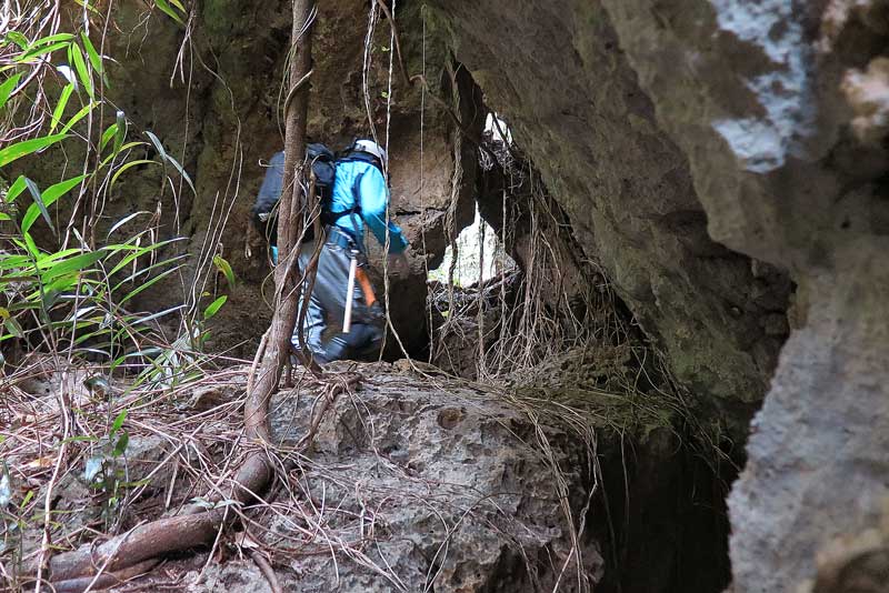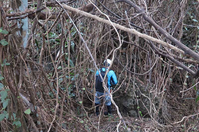 福岡さんが壕口に向かって斜面を登り始めました。15mぐらい登ると壕口に到達します。