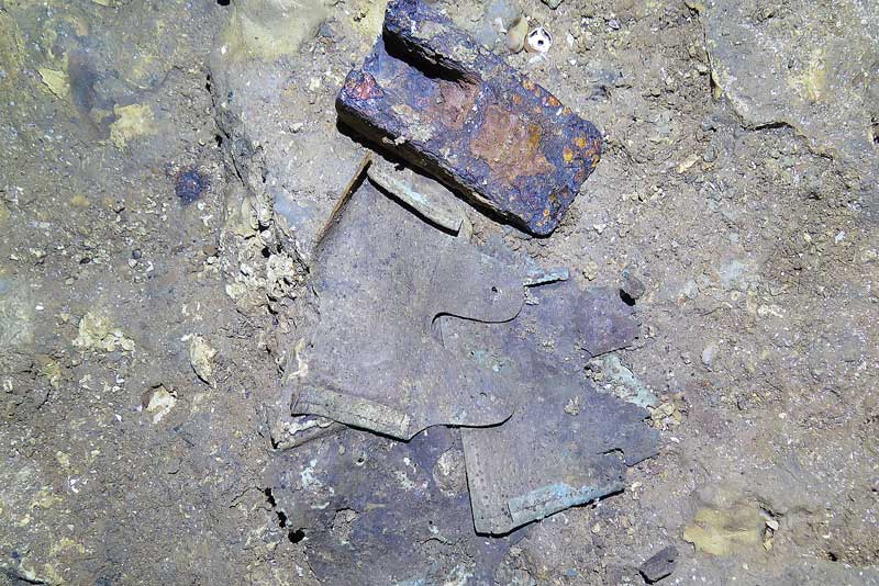 四角く成形された鉄の塊があります。何かはちょっと解りませんね。下の革製品は、前の写真でご紹介しましたが、将兵が被る鉄帽の内装材ですね。一つの鉄帽に三枚の内装材が頭への衝撃を和らげる緩衝部材として用いられています。