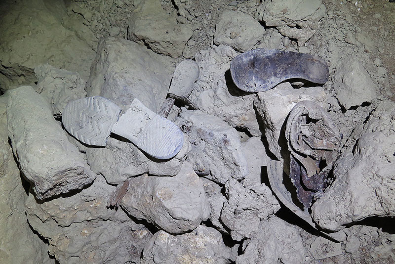 こちらも軍靴ですね。軍靴が泥にまみれています。あちこちこの軍靴と同じ光景が見えるのですが、多分大雨とか台風とかには、この壕内に大量の雨水が流れ込むようです。一時的に数十センチぐらい冠水してしまうようです。と言う事で、沖縄戦当時の梅雨時も、もしかしたら地際が冠水して居心地が極めて悪かった可能性がありますね。