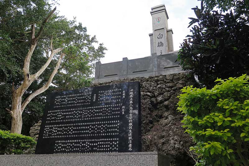 「白梅之塔」です。現在は四代目で、平成4年(1992年)6月に建立されました。同塔には、沖縄戦に従軍学徒として動員された生徒のうち、戦死した22名の白梅隊員をはじめ、教職員12柱、同窓生113柱、計149柱が合祀されています。沖縄県立第二高等女学校は、現在の那覇市松山公園の辺りにあった女学校です。「白梅之塔」は何時来ても管理清掃が行き届いているなと感じます。