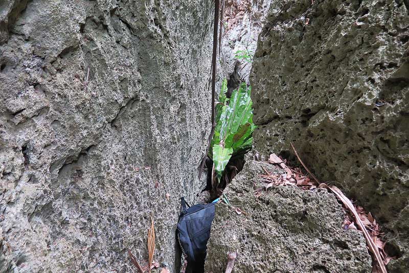 視界が開けました。右側は一枚岩の崖となっています。眼前にはトウツルモドキが繁茂していて容易には進めそうにありません。このトウツルモドキは、葉の先は巻きひげとなってからみつき、ジャングルで前に進むのを極めて困難にさせるやっかいな植物です。