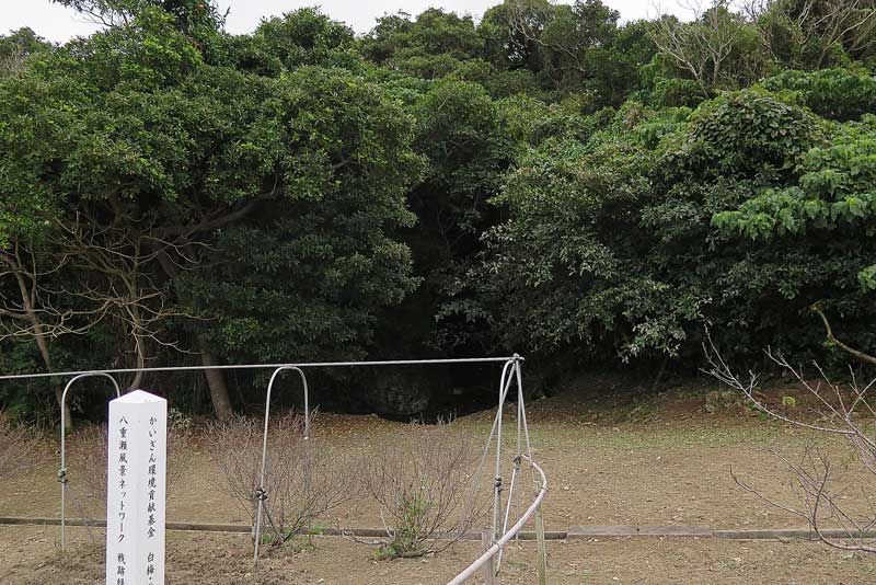 黒い穴が左右二つ見えますが、左側の穴が壕口です。右側のは浅い窪地で壕口のように見えるだけですね。裏口と言えるこの壕口も立ち入り禁止となって久しいです。この壕口は上空を飛ぶ米軍の偵察機やグラマンなどからは絶対に見えない絶妙な位置に口が開いているのが印象的ですよね。