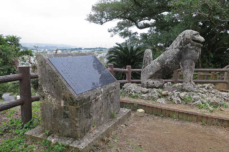 同石獅子の設置由来は、市のウエブサイトによりますと、「当時村中に不審火が多いことで困っていた富盛村の住民が、久米村の蔡応瑞(大田親雲上)に風水を占ってもらった結果、八重瀬岳が原因だと判明されました。その対処として山に向かって獅子を建てると良いとの助言を受けて設置されたと伝えられています」と書かれていますね。