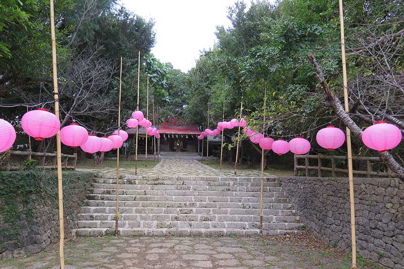 拝殿から見る本殿と境内の様子です。本殿も沖縄風と言いましょうか印象深いです。本殿の全体像は見えにくい状況ですね。いずれにしても、清浄な空気感が漂い、古のニライカナイ信仰(海の彼方より幸福を持ち来る神々に祈る)を今に伝えている気がする気が伝わって来るようです。(^o^)