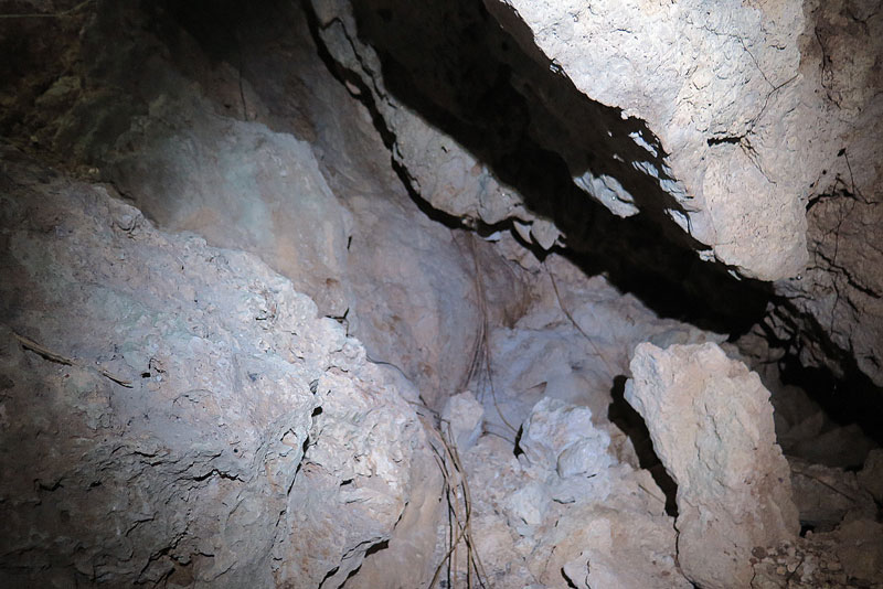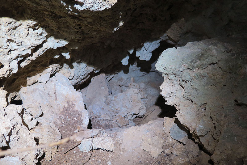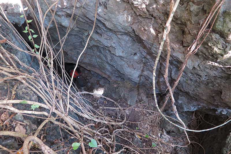 ここが、一段下の坑道へ降りるための入り口です。移動出来る岩は無いので現状以上に坑道を広げられない事から、坑道の大きさは沖縄戦当時も同じ形状であったと思われます。