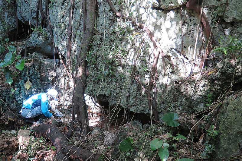 次の壕に移動しました。壕と書きましたが、ご覧のように、巨大な岩盤の下にある空間での探索作業となります。すでに三浦さんが作業しています。