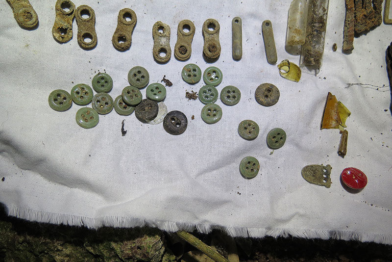 赤いのも穴が開いていますから、ボタンだと思われます。女性が着ていた服のボタンでしょうか? その左には地下足袋のコハゼが写されていますね。また赤いボタンの上側に、アンプルの先が写されていますね。これは本当に小さな物ですが、こんなのも見つけてしまうのですね。皆さんの集中力に脱帽ですよ。(^o^)