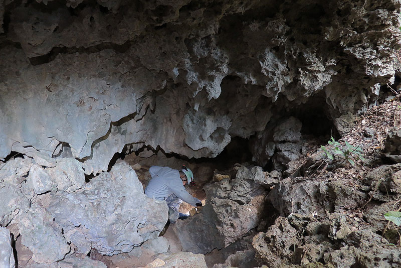 同じく上から福岡さんを撮影しています。福岡さんが岩の割れ目を見ていますが、人間が入れる寸法ではないようです。