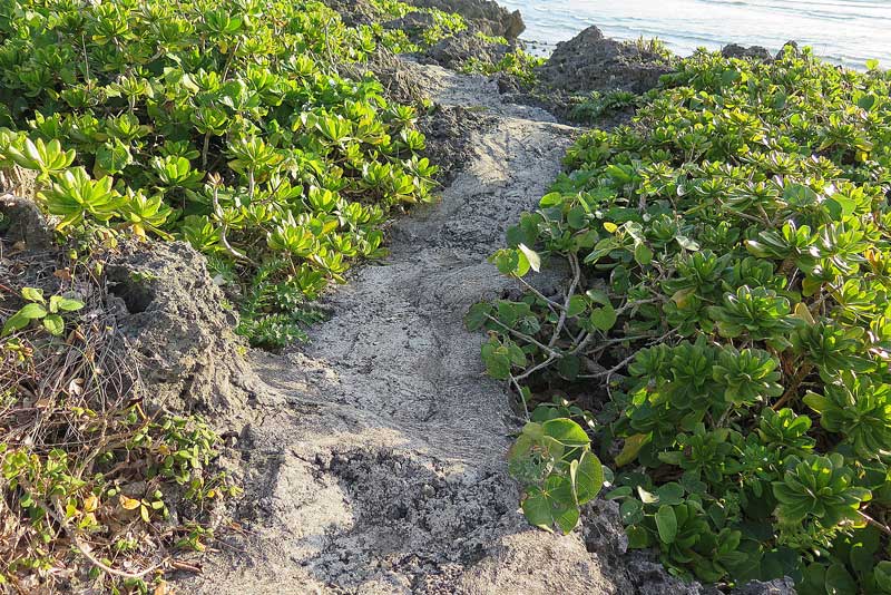 海が見えてきましたね。ご覧のように、この辺りはアダンが大繁茂しています。アダンは土が少ない岩場を好んで繁殖しますから、海岸線に近づく程に土が少ない岩場となっている証ですね。逆に言えば、土が無いと成長出来ないトウツルモドキは、この辺りでは生存できないと言う訳です。