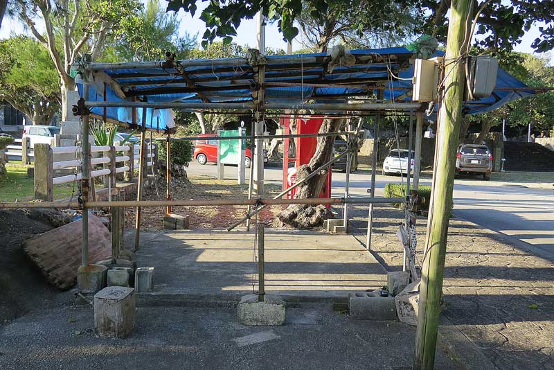 分岐道路を少し入った所で撮影しました。右側に曲がる車のタイヤの跡が沢山ありますが、これはダンプカーが出入りしている為に鉄板が敷いてある事によりタイヤ跡が残っています。繰り返しますが、右側へ約900m程進むと「ひめゆり学徒散華の跡碑」バス停に至ります。また直進すると荒崎海岸になり、先ほど紹介した「山城うりぐち(降り口)」と言う階段道で、海岸リーフへと降りられるようになっています。