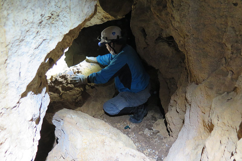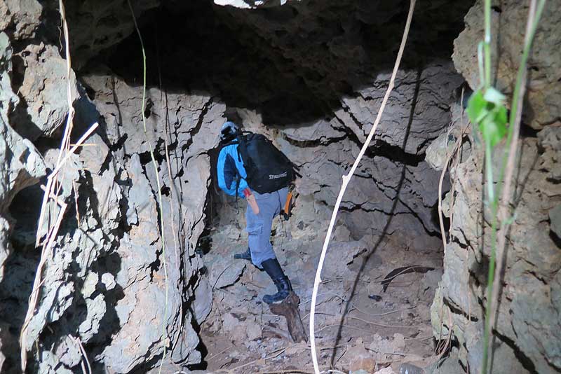 福岡さんが壕の中に入りました。更に坑道があるようです。