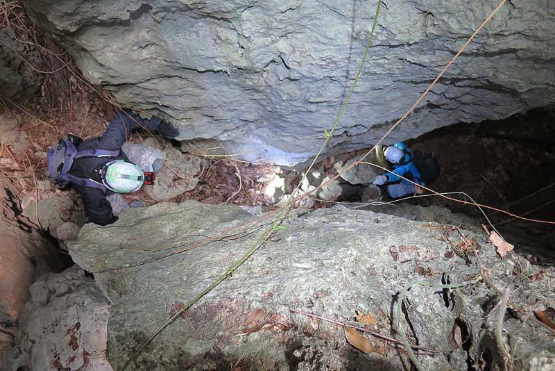 お~。8mぐらい下に平坦な場所が見えます。ただ絶壁に囲まれています。下はご覧のように、凄く広い空間があります。避難するには良い場所に見えますね。何としても降りてみたいです。