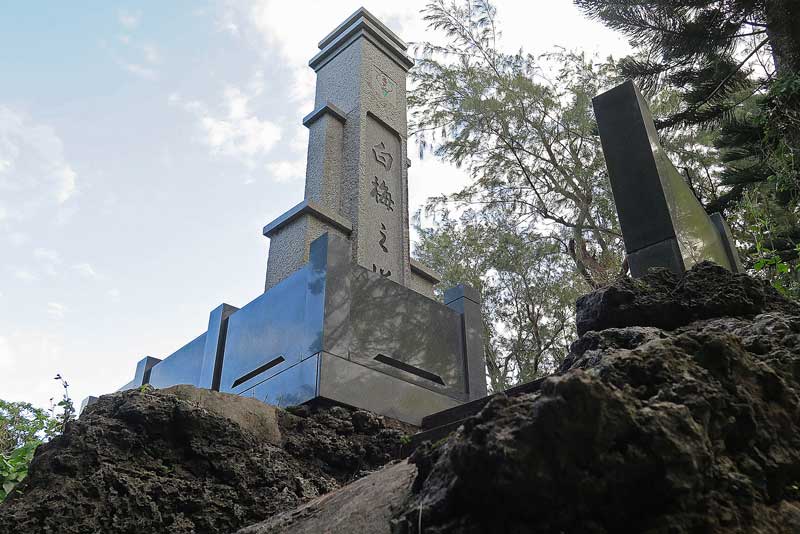 「白梅之塔 上の壕碑」です。昭和63年(1988年)6月、白梅同窓会により建立されました。沖縄戦当時この壕は「上の壕」と呼ばれ、自然壕を利用していたようです。同壕は、沖縄守備軍の食糧弾薬倉庫であると共に、白梅学徒看護隊員の仮眠所として利用されていたようです。背後にある縦穴があり、碑文には「6月22日米軍の攻撃を受け、軍人、白梅隊員および一般住民が死傷した」と書かれています。