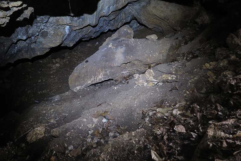 写真中央部辺りにご遺骨があります。遺骨収集の初心者の方は、ここにご遺骨があるとはまず見抜けないと思います。ご遺骨を見続ける事の大切さが改めて想起されます。ご覧のように、ご遺骨は完全に岩肌と同し色合いになっていますね。