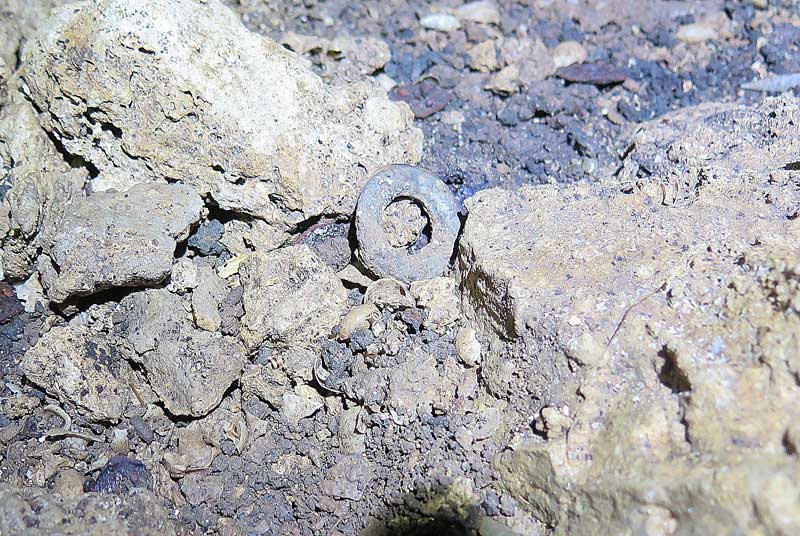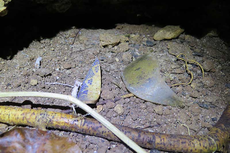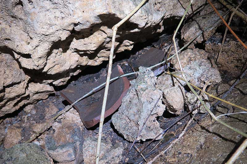 写真中央部辺りにご遺骨が写っています。このご遺骨はもしかしたら人間ではないかもです。骨端部が無かったり見えなかったりしていりので、見ただけでは断定出来ません。いずれにしても小さなご遺骨が数個見つかったので、この壕は改めて集中的に取り組むとして、前進する事にしました。