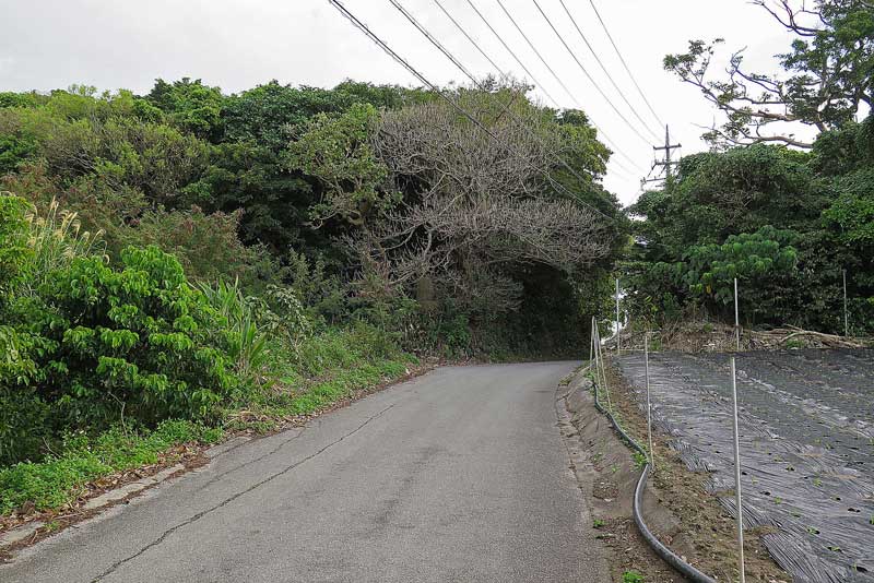 「糸洲の壕」は眼前の狭い舗装道路を80mほど直進します。実は「糸洲の壕」のある場所が見えています。写真右端に、こんもりした樹林のある場所が写されていますが、そこに「糸洲の壕」があります。