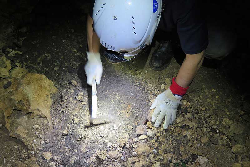 納骨室の中を見ています。少し解りにくいのですが、開口部の上側や右隅部分を見て下さい。ご覧のように、納骨室の奥の方は土盛りが無いのが見て取れますね。納骨室の中にある土砂は、納骨室のすぐ横を掘った際に出た土砂を投げ入れたと考えられます。