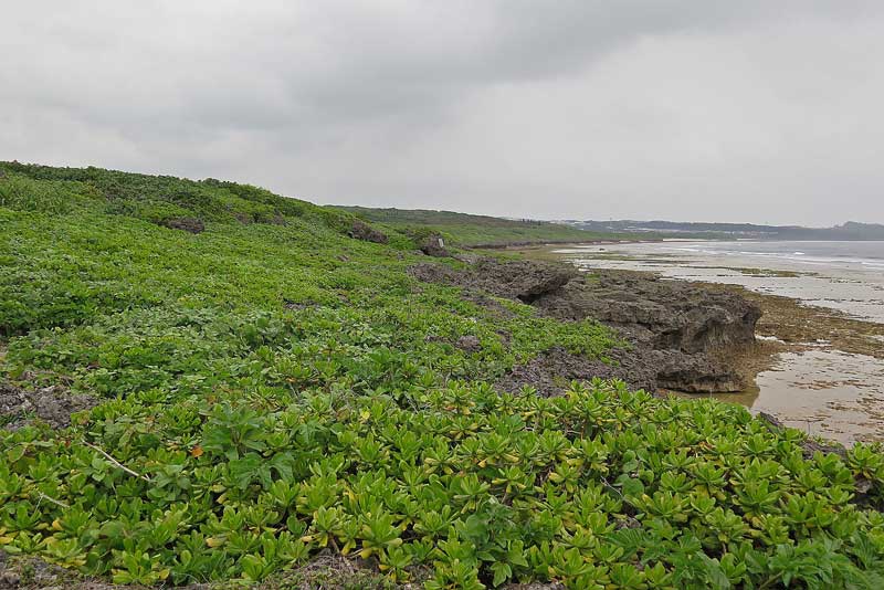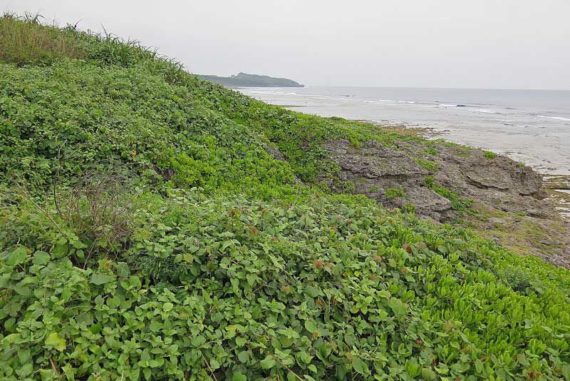 海が見えてきましたね。ご覧のように、この辺りはアダンが大繁茂しています。アダンは土が少ない岩場を好んで繁殖しますから、海岸線に近づく程に土が少ない岩場となっている証ですね。逆に言えば、土が無いと成長出来ないトウツルモドキは、この辺りでは生存できないと言う訳です。