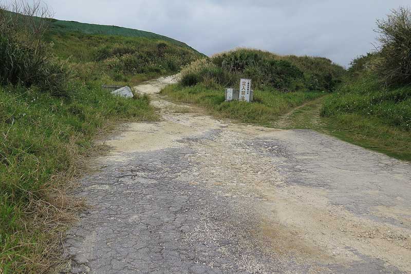 分岐道路を少し入った所で撮影しました。右側に曲がる車のタイヤの跡が沢山ありますが、これはダンプカーが出入りしている為に鉄板が敷いてある事によりタイヤ跡が残っています。繰り返しますが、右側へ約900m程進むと「ひめゆり学徒散華の跡碑」バス停に至ります。また直進すると荒崎海岸になり、「山城うりぐち(降り口)」と言う階段道で、海岸リーフへと降りられるようになっています。