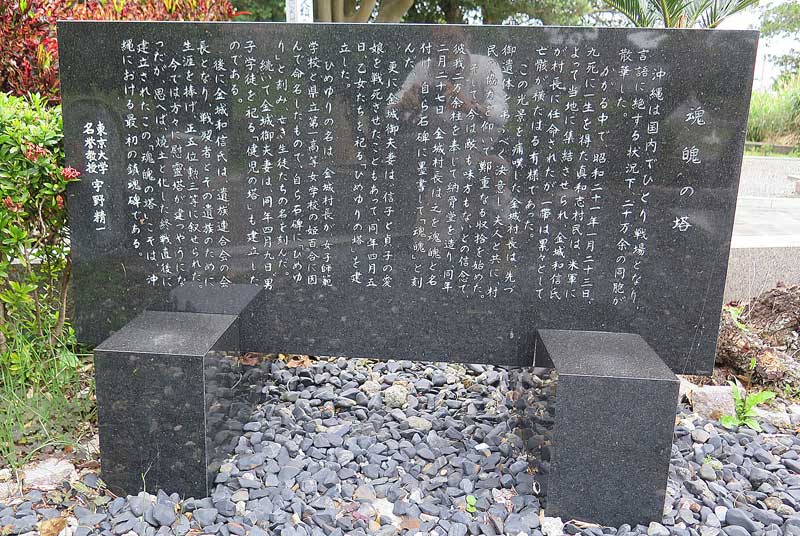 ずゐせんの塔は、第二次世界大戦沖縄戦で戦死した沖縄県立首里高等女学校看護隊並に職員同窓会員の御霊を祭ってある。昭和二十年一月二十五日から軍医の講習を受け、引き続き合宿訓練に入った後、三月二十七日野戦病院壕で卒業式を挙行、直ちに第六十二師團、石部隊野戦病院に配属され最前線の浦添から首里、摩文仁へと負傷兵を看護しつつ、泥○の中を弾雨に叩かれ、奮闘したが惜しくも散華したのである。