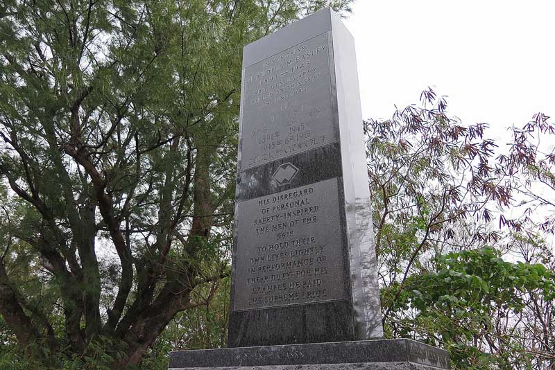 こちらは、「米国陸軍准将クローディアス・M・イーズリー追悼碑」です。写真では反射で解りにくいのですが、同碑は英語と日本語で碑文が刻まれています。日本語では「米国陸軍准将クローディアス・M・イーズリー 1891年‐1945年 1945年6月19日 この地に於いて戦死す」と書かれていますね。戦死した日付が19日となっている事から、サイモン・B・バックナー中将が戦死した翌日に、同じように狙撃されて戦死しました。与座で日本軍陣地に対する戦闘指揮中に、日本軍陣地から発射された二発の機関銃弾によって前頭部を撃たれての即死だったようです。