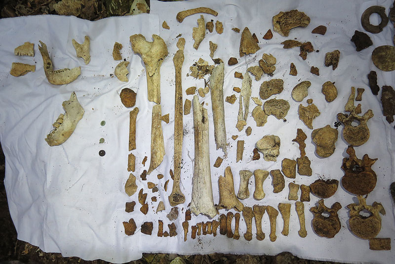 今年収骨された頭蓋骨の骨片をご覧下さいませ。下顎骨の右側が写されています。上掲写真をご覧下さいませ。昨年発見された下顎骨二つのうち、一つは下顎骨の左側しか収骨されていませんでした。今回右側が収骨されたと言う事で、左右を並べて骨の大きさが対称になっているかを確認してないので断定は出来ませんが、一応二人分の下顎骨が揃ったと言う事にはなりますね。