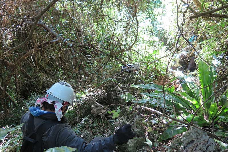 ある程度道は作ってあるので、比較的歩きやすいと思います。見た目も何となく道っぽくなっていますね。ご遺骨が発見された以降は、必ず糸満警察署の警察官と遺骨収集情報センターの調査員の方が訪れる事となるので、私達はジャングルの行き来する道と定めたルートを通る度に、手には剪定ばさみやノコギリを持ち、パチパチ、ガリガリと蔓植物の蔓や細い木などを切るなど、より歩きやすい道に改変するように往復の時間を費やします。