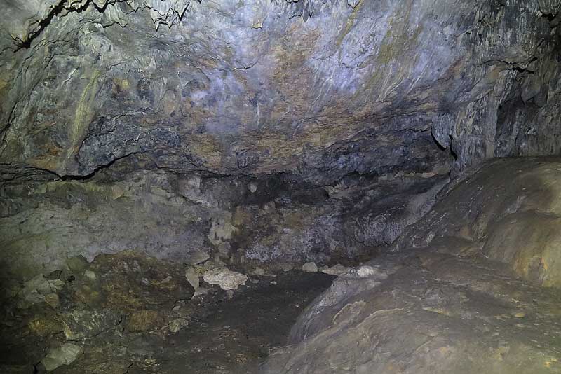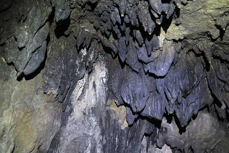 この壁面も煤で真っ黒です。白い岩の部分は、鍾乳石の流れ落ちる水により、煤が洗い流され白くなったのだと思われます。