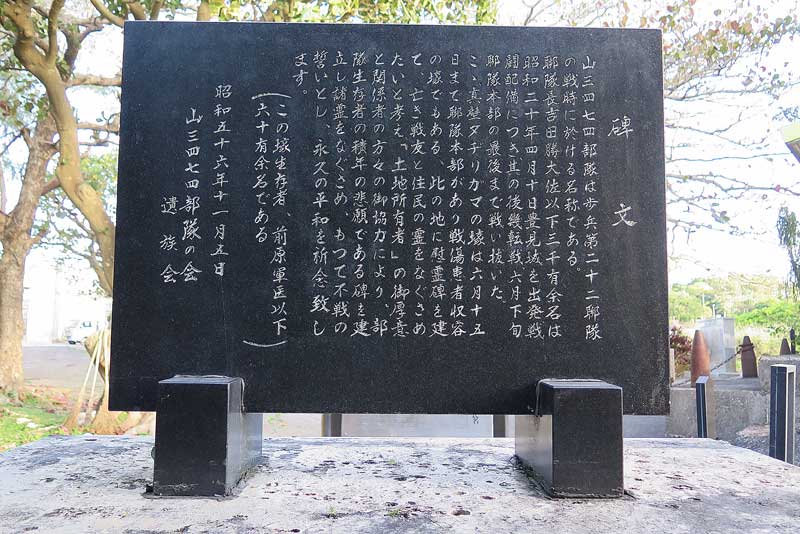 斯くして昭和十九年六月二十日我が聯隊は沖縄第三十二軍に転出仝年七月十二日沖縄到着第五砲兵団長和田孝助中将(元聯隊長)隷下の球四四〇一部隊と呼称し聯隊本部及第二大隊を沖縄本島に第一大隊を宮古島に配備し沖縄攻防戦に参加す 昭和二十年四月米軍沖縄本島に上陸を開始するや熾烈なる敵の艦砲射撃と間断なき砲爆撃下全軍の骨幹となり勇武を誇る聯隊の名誉と光輝ある伝統を遺憾なく発揮し奮戦敢斗せるも遂に衆寡敵せず仝年六月二十二日聯隊長山根忠大佐以下七三九柱の将兵は祖国日本の永遠の平和と繁栄を祈念しつつ我国悠久の大義に殉じこの地南冥の島に火砲と運命を供にし玉砕せり