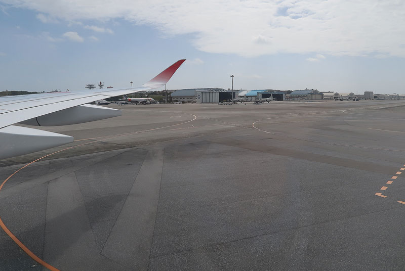 飛行機は羽田空港離陸後、約三時間程で那覇空港の新しい滑走路(第二滑走路)に着陸しました。新滑走路は埋め立て面積が約160ヘクタールと、大規模に造成され令和2年(2020年)3月26日から運用開始となりました。那覇空港上空の雲が少ない事からも解るように、冬型も緩んで北風も弱いらしく安全安心なランディングでした。古い第一滑走路と新しい第二滑走路とはかなり離れていて、その離間距離は、なんと1,310mもあるそうですよ。広大な海面が埋め立てられたのが判ります。