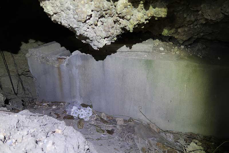 壕口から2mぐらい中に入ると、ご覧のようにコンクリート製の納骨室が、壕内の広い空間を埋めるように設置されています。ここからは納骨室に沿って左に進みます。