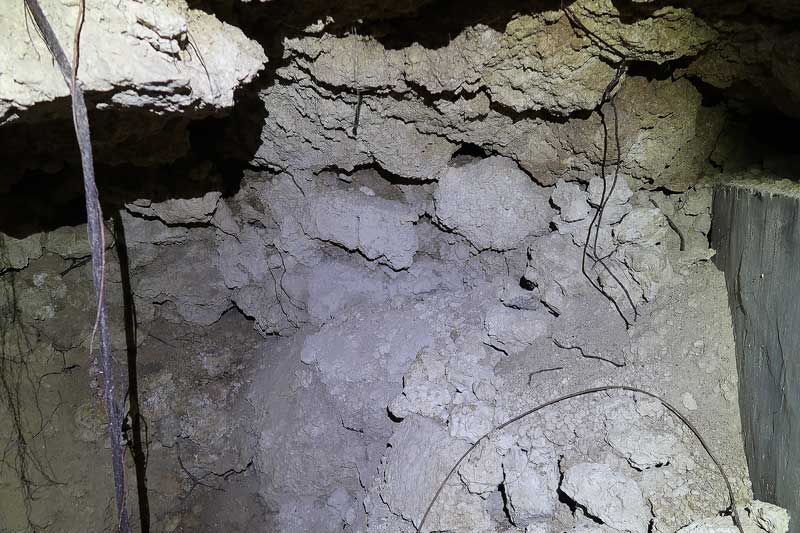 誰かが深く掘り返した場所の天井の岩盤を見てビックリです。今にも落盤しそうな雰囲気ですよ~~~。(^_^;)