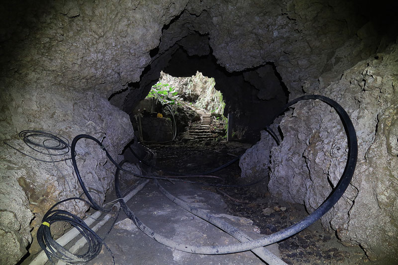 坑道が狭くなりますね。狭い坑道の先に川が流れている場所に出ます。黒いホースは農家が取水する為に敷設したものです。それにしても、ここで平和学習するのですから、生徒さんが躓いて転ばないように、黒ホースを整理整頓出来ないものでしょうかね~。(^^;)
