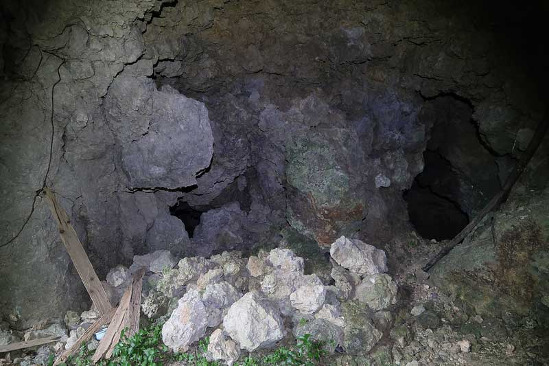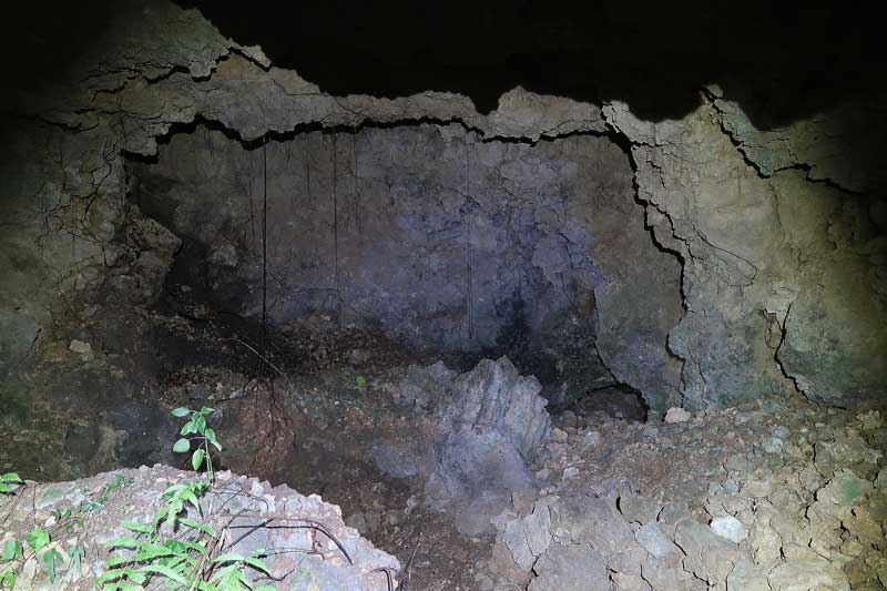 壕口を写しています。私が最初にこの壕に訪れた時は、壕内の地盤と、壕外の地盤はほとんど同じレベルでした。壕口の外側3mぐらいの範囲で、台風などの風雨で壕上部から流れ落ちた土砂が堆積して地盤が少し盛り上がっていたと言う状態でした。と言う事で、現在のご覧のような状態を考察するに、巨岩の落下と共に、大量の土砂も一緒に落ちてきた‥‥。と推察されます。