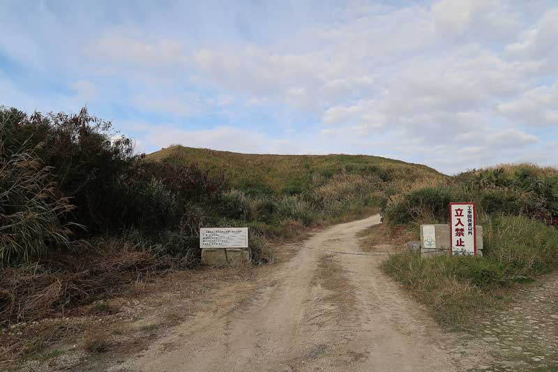 「マヤーアブ」のある場所にやって参りました。壕のある場所は糸満市山城にある「平和創造の森公園」内です。マヤーアブに行くための道に金網が設置されています。令和4年(2022年)1月21日に訪れた際には、既に金網が設置されていました。崩落の危険があるので立ち入り禁止になったようです。金網から20mぐらい奥まった所に壕口があります。