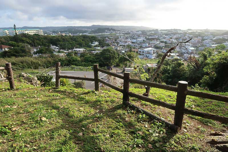 東風平町字富盛にある「八重瀬の塔」は、緩斜面のこの写真の左手にあり、ご覧のように脇道を上がっていきます。写真に写されている大きな道路は県道52号線ですね。「八重瀬の塔」は駐車場が無いのが苦労する点です。