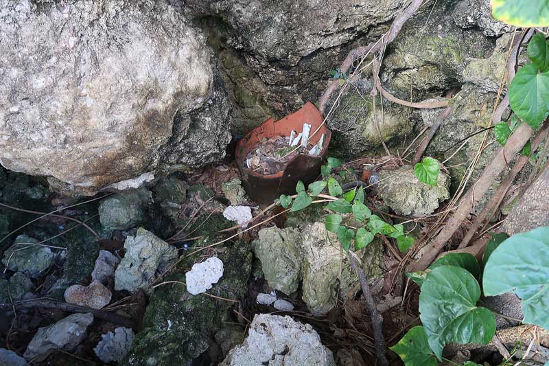 再びこの場所にやって来ないように、収骨作業現場からかなり離れた地面にヤシガニの赤ちゃんを置きました。写真中央部の丸っこいのがヤシガニ君です。時折見に行きましたが、ずっと丸まったままでした。二時間経過した頃でしょうか、その時には居ませんでした。ヤシガニ君は夜行性なので、眠い目をこすりながら移動していったのでしょうか。サイト管理人も、ヤシガニを見るのは4回目か5回目ぐらいです。非常に希にしか見かけません。