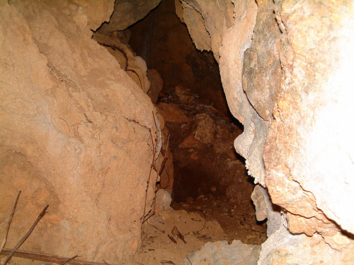 私がここに最初に降り立った時は、確かに小さな横穴はあるものの、懐中電灯で照らして見た限り横穴が奥深く続いているとはとても思えませんでした。第一印象では人間が入っていけるような穴ではないと思ったのです。しかし、直感的に目の前にある土石は上から流れ落ちてきたものだと思えたので、可能性を信じて土を掘り返して穴を広げようと奮闘してみたのです。一生懸命掘り進めたら、穴が広がって行くではないですか~。(^_^)v