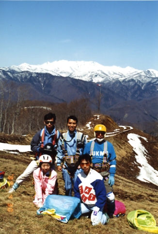 私が初めて体験したスクールは、群馬県水上町にある宝台樹スキー場でパラグライダー教室を開催していた「JMBパラグライダースクール宝台樹」でした。私とほぼ同じ時期にパラグライダースクールに入校した同期の仲間です。後列中央が私です。私が入校したこの時期は、パラグライダーの黎明期であり、ほとんど社会的に認知されていませんでしたね。しかし、これ以降急速にパラグライダーブームと呼ぶべき時期が到来しましたのです。私達は先鞭をつけたといって良いでしょう。